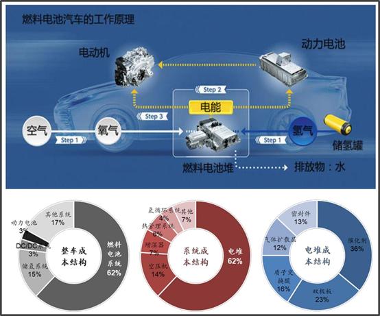 从成本端来看,燃料电池系统在氢能车购置成本中占比超过60%,而电堆成本在系统中占比同样超过60%,是氢燃料电池汽车占比最高的成本项。