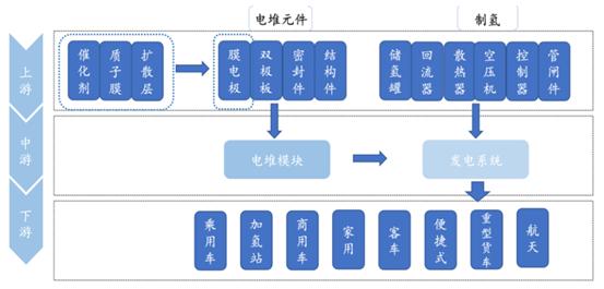 1.氢燃料电池产业链上游:包含储氢罐、膜电极和极板等电池元件。其中由催化剂、质子膜和扩散层组成的膜电极是燃料电池的核心技术所在。