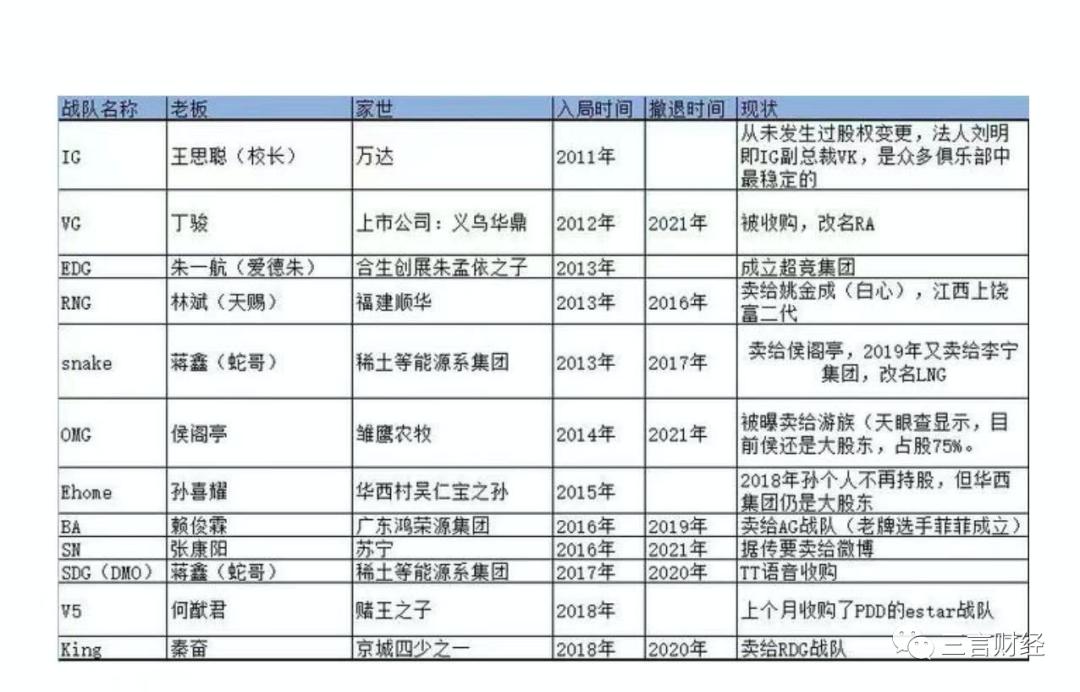 丁骏的VG战队被收购,改名为RA;林斌的RNG卖给了姚金成;蒋鑫的snake被卖给侯阁亭后,又被侯阁亭卖给了李宁集团,改名为LNG;侯阁亭的OMG被曝卖给游族,但天眼查显示,目前侯阁亭还是大股东;赖俊霖的BA卖给了AG;张康阳的SN,据说要卖给微博;秦奋的king战队卖给了RDC......