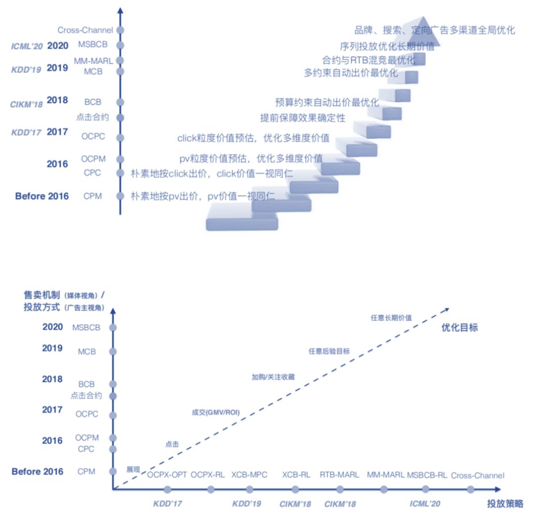 我们以一个示例来略窥一二,以下两个图展示的是目前中国最大的网络广告公司阿里的广告技术的发展历程,通过三方面技术优化,力争达到收益最大化: