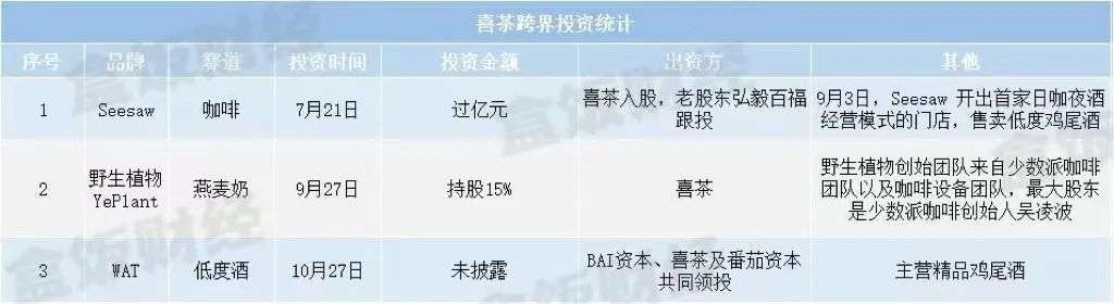 10月27日,预调酒品牌WAT宣布已经完成A轮融资,喜茶的名字赫然出现在投资方列表。