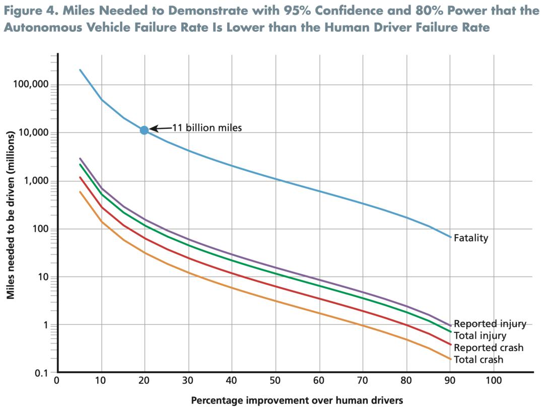 这也是兰德公司早在2016年就提出,「L4级无人驾驶车辆的量产需要测试177亿公里(110亿英里)以上才能实现」的原因——毕竟驾驶行为是涉及到“人命关天”的大事,哪怕在驾驶行为的处理中有0.1%的概率出现问题,都有可能会造成车毁人亡的大事故。
