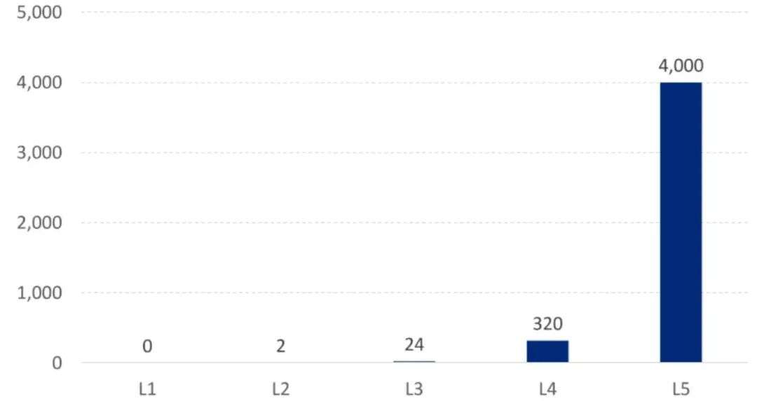 进入到L4和L5阶段之后,还需要加入紧急事件触发接管机制,此时对算力的要求几乎是呈现「指数」级的上升,达到320TOPS和4000TOPS。