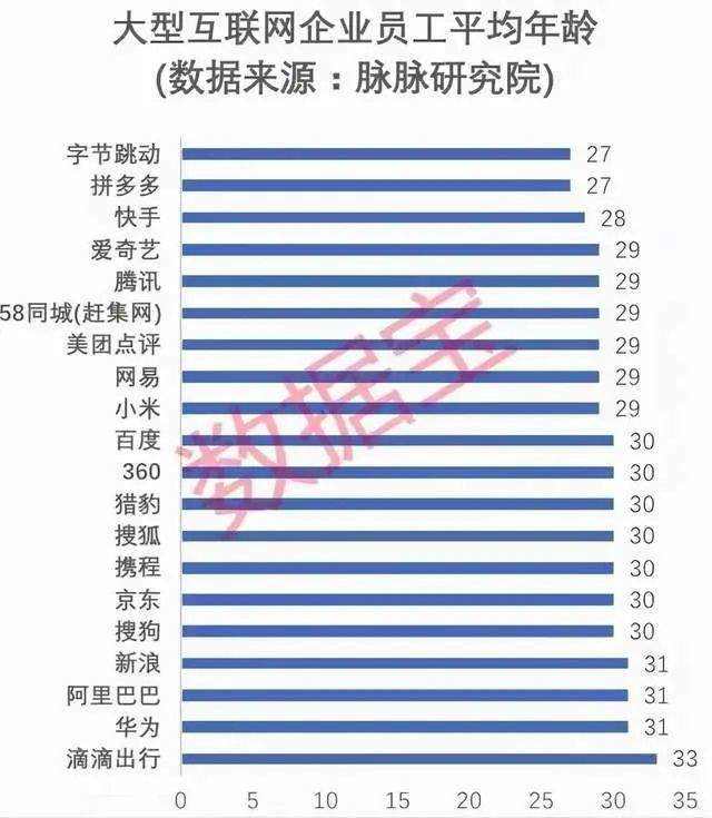 据脉脉数据研究院数据显示,目前中国大型互联网企业员工的平均年龄均不超过35岁,在27岁到33岁范围区间不等。字节跳动和拼多多员工平均年龄相对最低,仅27岁,快手和爱奇艺员工平均年龄紧随其后,分别为28岁和29岁,滴滴出行员工平均年龄最高,为33岁。