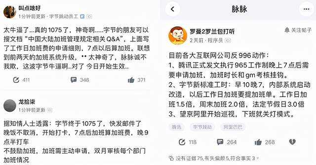 11月1日,某位字节员工爆料,字节跳动开始采用“1075”工作制,每天十点上班七点下班,一周工作5天。此外,加班需要提交申请,每天最多加班3小时,并按照工作日1.5倍、休息日2倍、节假日3倍的标准计算加班费。