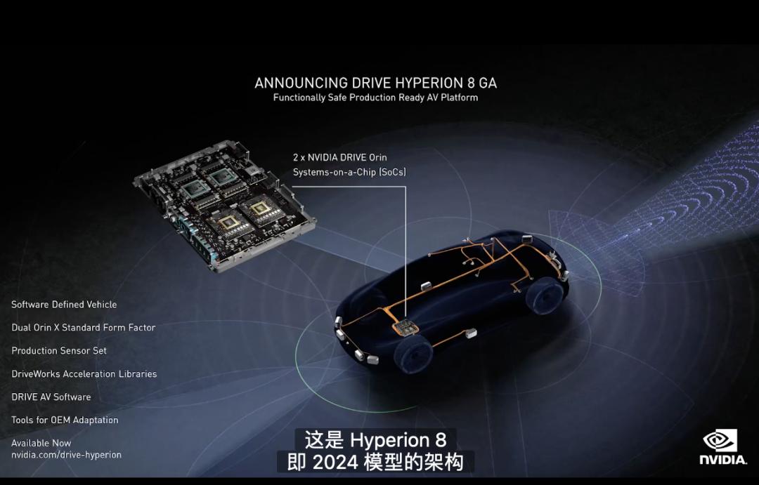NVIDIA Drive 是一个全栈式的开放自动驾驶平台,而 Hyperion 8 则是英伟达最新的完整硬件和软件架构,它的传感器配置包括:12 颗摄像头、9 颗毫米波雷达、12 颗超声波雷达和一个前置激光雷达,另外,Hyperion 8 还配套了两颗 Orin 芯片。