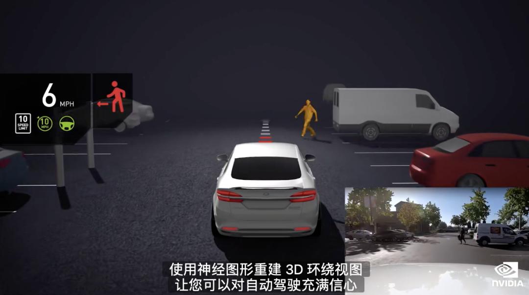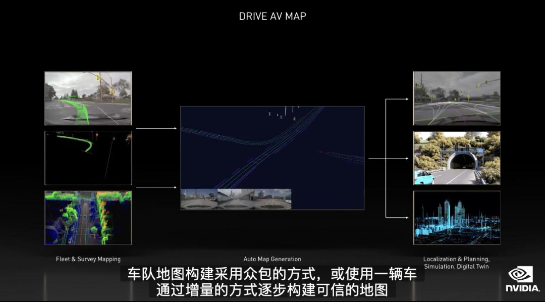 这一段老黄的高能输出,都是在强调英伟达自动驾驶架构 Hyperion 8 发展的重要基石,即是数据和多传感器融合方案,并且他们通过物理模拟的方式,获得了精准的光束反射。另外,辅以高精度地图的作用,让他们的自动驾驶方案又多了上 帝视角,且多了一重冗余。