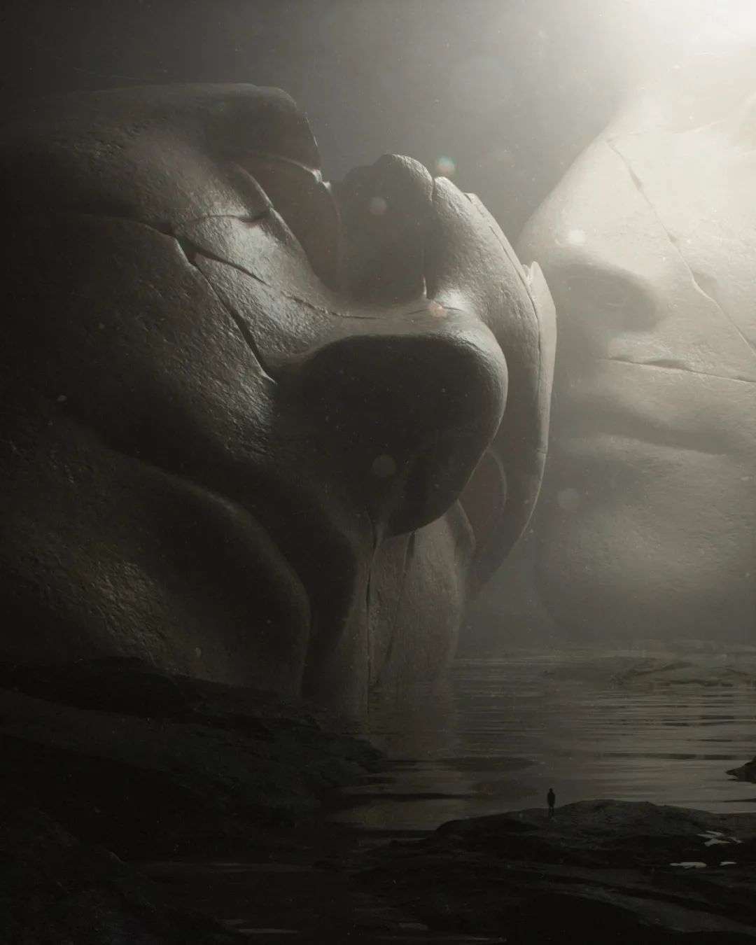 Stuart Lippincott的作品中最具有代表性的是人头像,这已成为他固定的创作主题。这些人头像由巨大的石头雕刻而成,每一颗头都有着大大小小、深深浅浅的裂纹,有的甚至已经快破碎,或者倒在海洋之中,看上去已经年代久远。一幅人头像的名字就叫Days Of Old,它的半边脸部已经塌陷,剩余部分也布满裂纹,但仍保持着仰着头的姿态,阳光与它正面相遇,仿佛一场洗礼,人类站在它的前面,小得看不见。