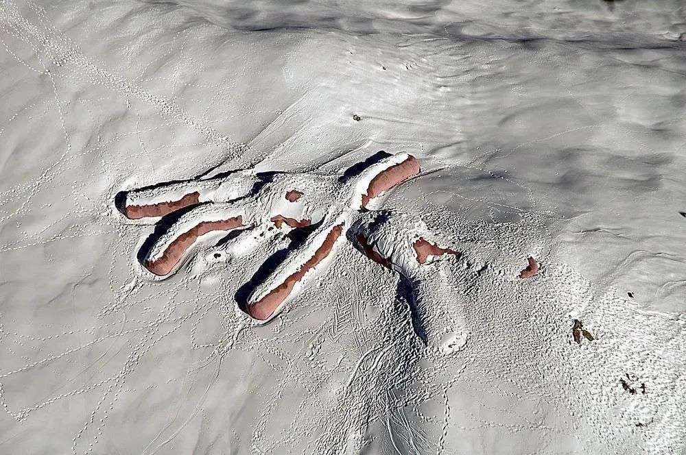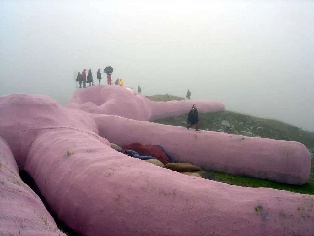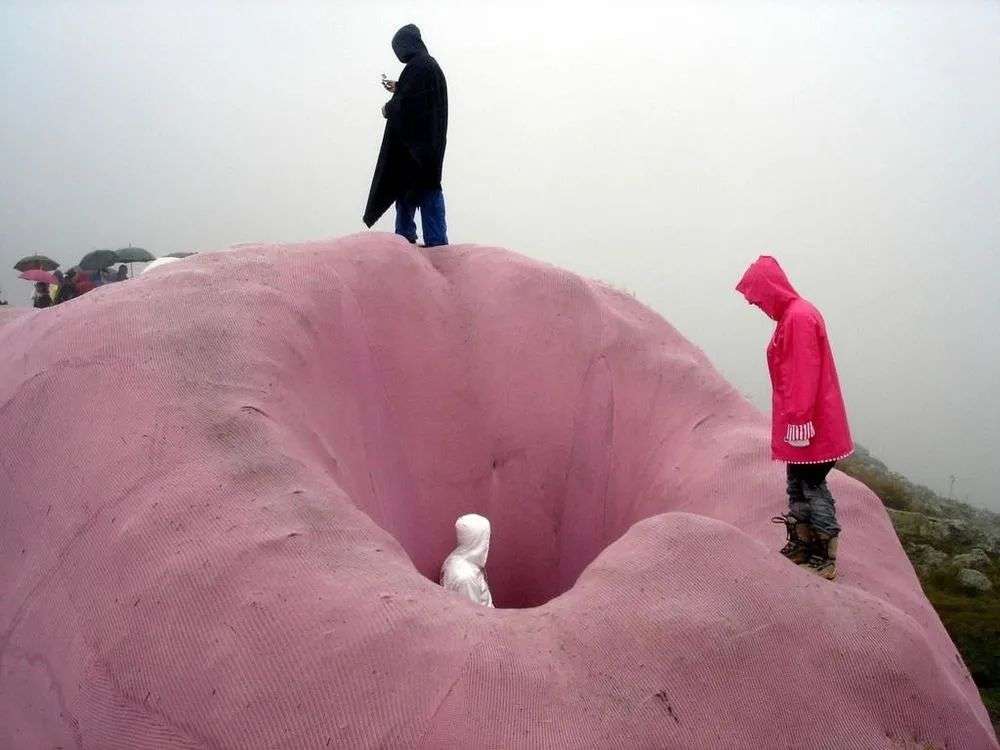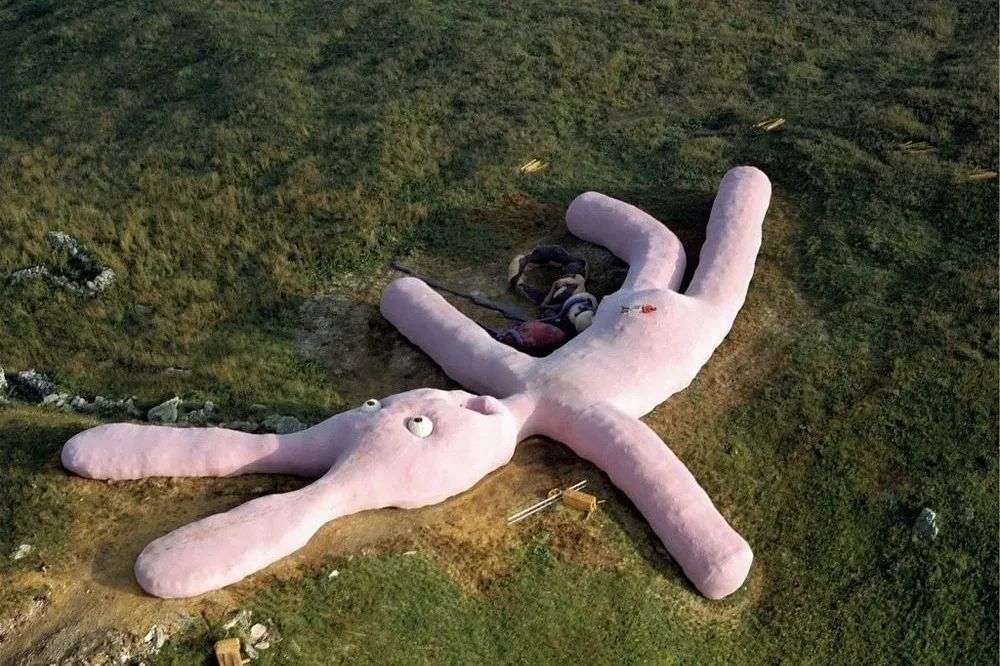 这是一只名叫“Hase”(来自德语)的兔子,它体型庞大,足足有60米长,在卫星地图上也能看见。远看并没有什么奇怪,从天而落的粉扑扑大兔子,像小孩子梦想得到的超大型毛绒玩具。再靠近一点就能发现异样,它的眼球凸出,几乎就要脱落出来,嘴形也是惨叫状。粉色的身体旁摆着一个长长的布包,Gelitin解释说那是它的肠子,这只粉色的兔子正在走向死亡。