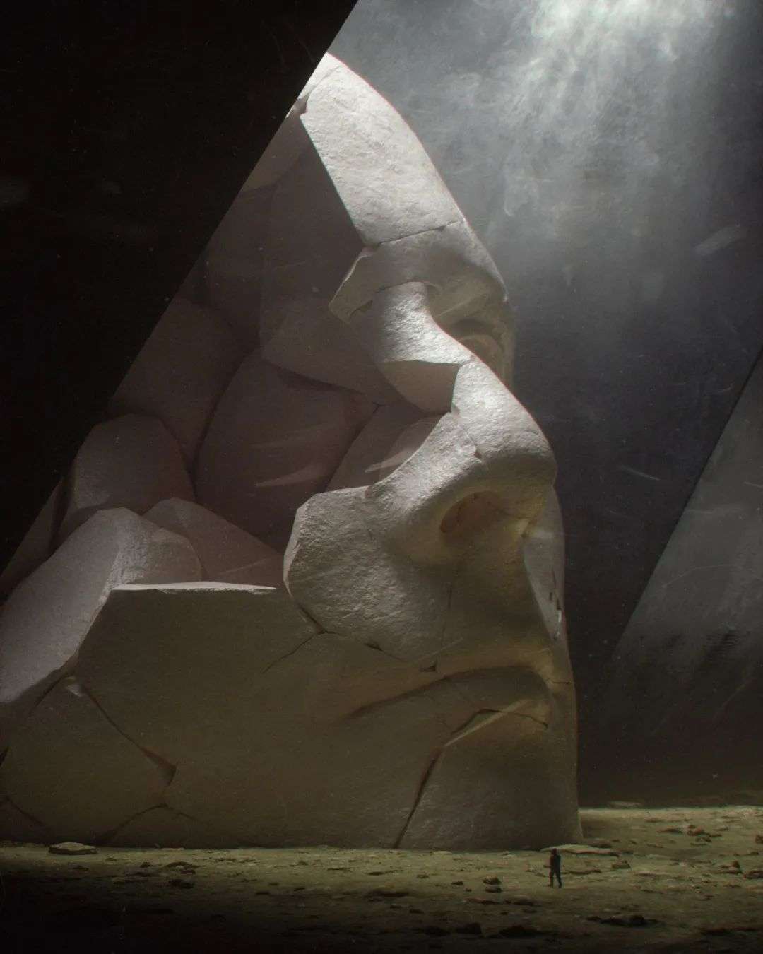 Stuart Lippincott总会在合适的场景放置小小的人类,与这些巨大的人头像形成对比,人类的服饰却很现代,给人一种发生在当下的感觉。