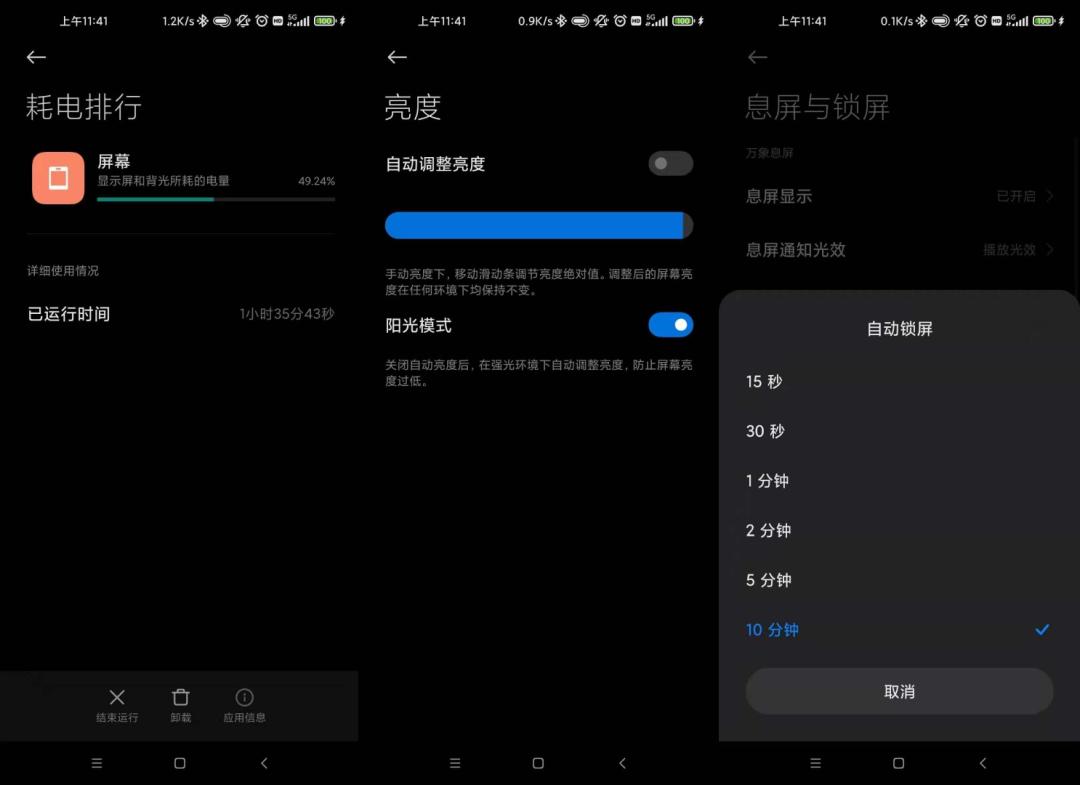 根据小米的统计,“屏幕设置成常亮”、“屏幕一直开启最高亮度”和“开启了通知时亮屏”这三项屏幕相关的耗电原因占比高达33%。根据小雷亲身体会,为了手机能够即拿即用,将手机锁屏时间设置为“常亮/十分钟后”的情况确实很常见,因为安卓手机自动亮度不够灵敏的缘故,很多用户也会手动将屏幕亮度维持在较高的水平,再加上取代呼吸灯作用的“通知亮屏”,自然会造成电量的过快消耗。