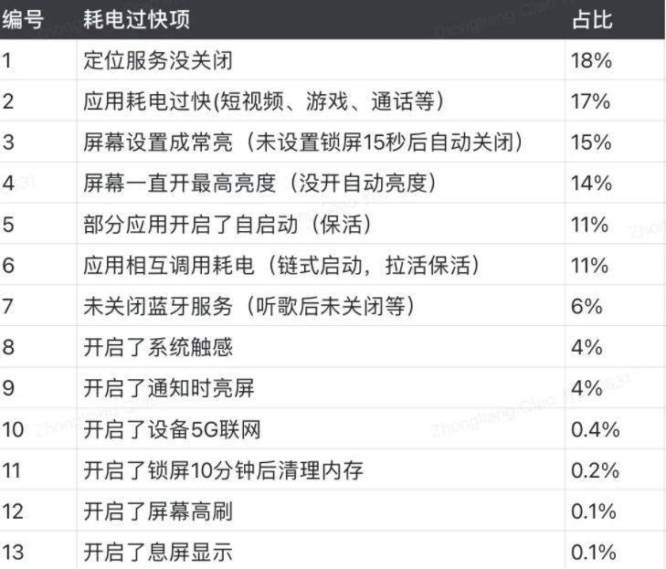 根据小米官方给出的耗电调查报告,目前小米手机异常耗电的原因共有13类,其中包括定位服务没关闭、应用耗电过快(短视频、游戏、通话等)、屏幕设置成常亮(未设置锁屏15秒后自动关闭)、屏幕一直开最高亮度(没开自动亮度)等等,基本能够囊括目前市面上所有手机普遍会遇到的情况。