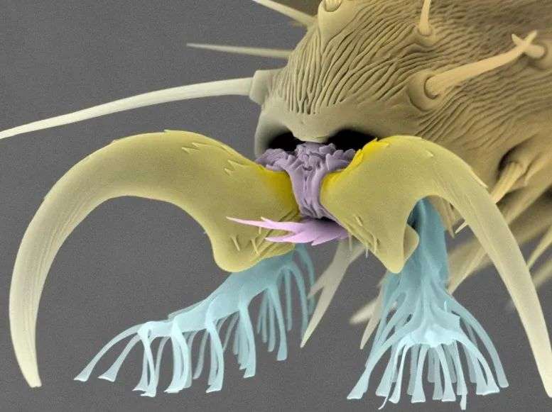 铲铲形状的脚毛(刚毛,浅蓝色)是果蝇能吸附在垂直表面上的关键因素之一。图片来源:Hokkaido University of Education