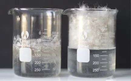 左为一般羽绒,右为防水羽绒遇水的样子,可看到羽绒浮在水面上 / 网络