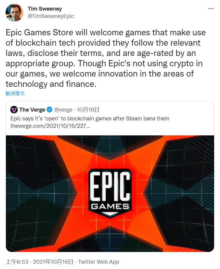 作为占据游戏发行超过半壁江山的最大游戏平台Steam的新锐竞争对手Epic Games,则对此做出了相反的决策。Epic Games Store将欢迎使用区块链技术的游戏,前提是它们遵守相关法律,公开其条款,并进行适当的年龄分级。尽管Epic并未在游戏中使用加密技术,但它们欢迎技术和金融领域的创新。