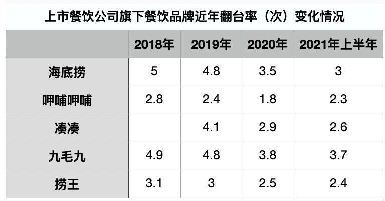 然而,2020年这一数据跌至3.5次/天,2020年疫情影响较大,但2021年上半年疫情缓解的情况下,翻台率进一步下滑到3.0次/天,其中新开餐厅翻台率仅为2.3次/天。