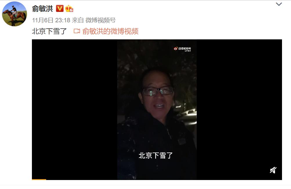 那天下午,他还在个人微博上发布了北大燕园雪景的视频,配文:雪中的北大好美。再前一天晚上,俞敏洪在自拍的 1 分钟视频里露脸,吐出一句「瑞雪兆丰年」,被包裹在漫天飞雪中。