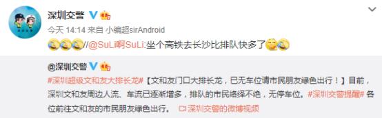 当时一度火爆到深圳交警发文,“请市民朋友绿色出行。”有网友更是调侃称,坐个高铁去长沙都比排队快多了。