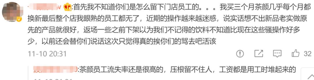 不过,评论中也有不少网友吐槽茶颜悦色员工流失率高、下架多款饮品等: