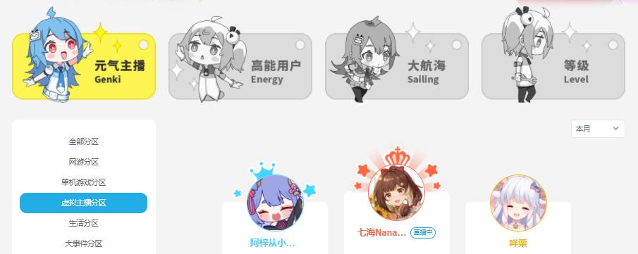 B站的直播版块中,虚拟主播是被专门列出的分区,虚拟主播们也有专属的排行榜。
