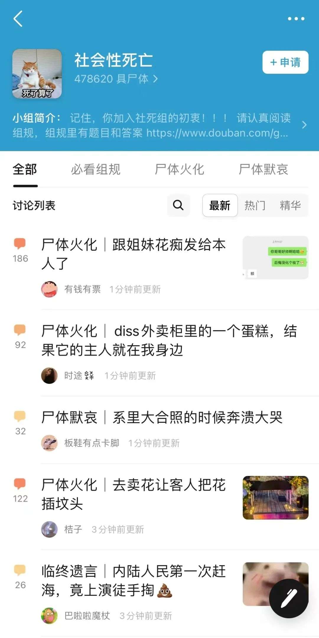 比如在豆瓣的“社会性死亡”小组中,组员乐于分享自己的社会性死亡事件来宣告自己的“尸体”身份,在帖子之间的互动与发帖者和评论区的互动中加强对“经历过大尴尬事件的人”这一共同身份的共鸣,以达到相互安慰、抱团取暖的目的,在心理上有“依附于群体”的归属感。