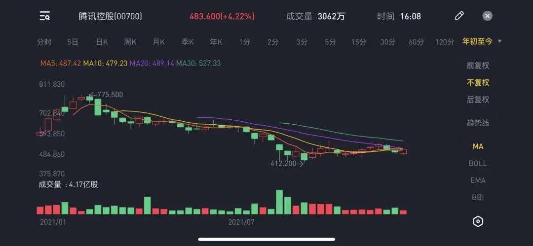 近一年来,腾讯股价波动较大,较高位下跌了超30%。年初,腾讯股价达到775.5港元/股之后,一路下跌,截至11月10日收盘,腾讯股价报收483.60港元/股,总市值4.64万亿港元,约合3.81万亿元人民币。