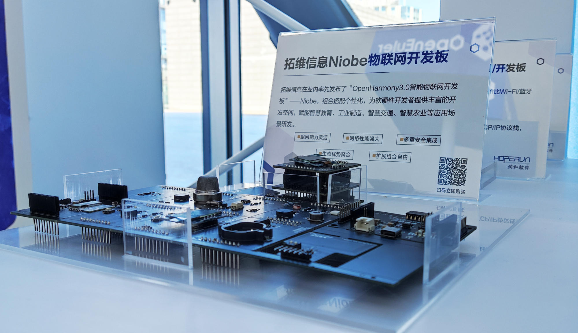 谈到openEuler和OpenHarmony的生态互通、能力共享,华为副总裁、计算产品线总裁邓泰华在大会主题演讲中以工业场景举例,openEuler适用于高可靠、强确定性的工业设备,OpenHarmony适用于强交互性的工业终端,openEuler和OpenHarmony的协同对接,可以提供全栈式工业场景化解决方案。同时提到伙伴里拓维信息也在同时基于openEuler和OpenHarmony开发商业发行版。作为OpenHarmony项目群A类候选捐赠人,今日在OpenHarmony展台展示OpenHarmony3.0智能物联网开发板——Niobe,吸引了众多业内人士现场咨询。