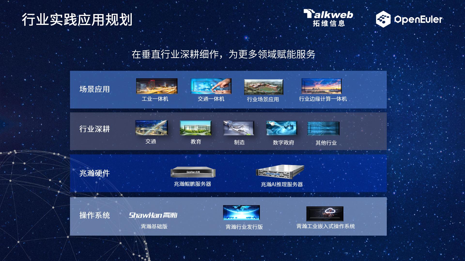 拓维信息基于前期操作系统技术自研的沉淀,全力践行全栈国产自研的决心和使命,在2020年便成功以“鲲鹏服务器”和“openEuler操作系统”创新双引擎打造了操作系统的1.0基础版本。本次发布的 2.0升级版——“霄瀚”全场景操作系统,是在参与openEuler技术社区共建的同时,不断在工业、交通等行业实践创新后打造的全新操作系统成果。
