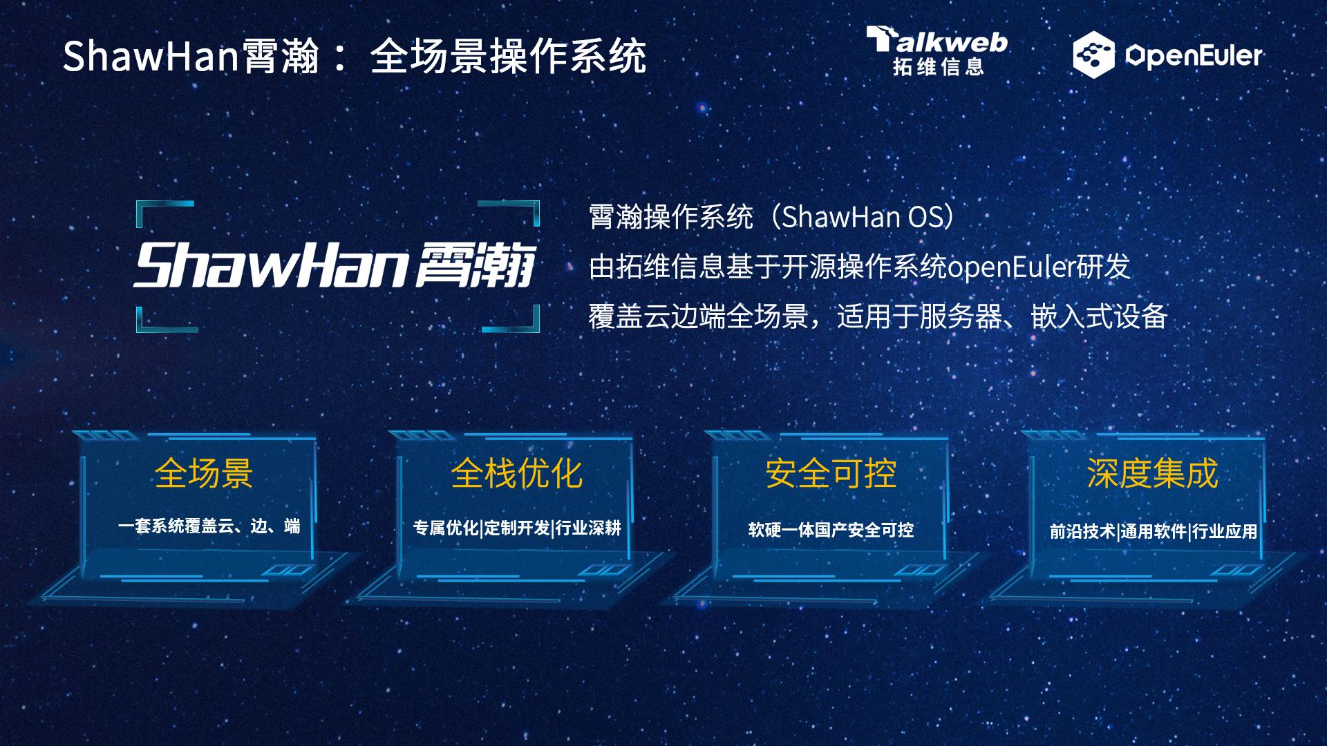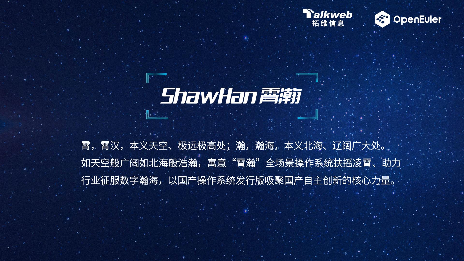 11月10日,拓维信息副总裁解伟俊受邀在openEuler Summit 2021“分布式&多样式计算技术分论坛”上发表了主题为《霄瀚全场景操作系统的实践与应用》的精彩演讲,首次对外发布了拓维信息基于openEuler自研操作系统的 2.0升级版——“霄瀚”全场景操作系统(ShawHan OS)。