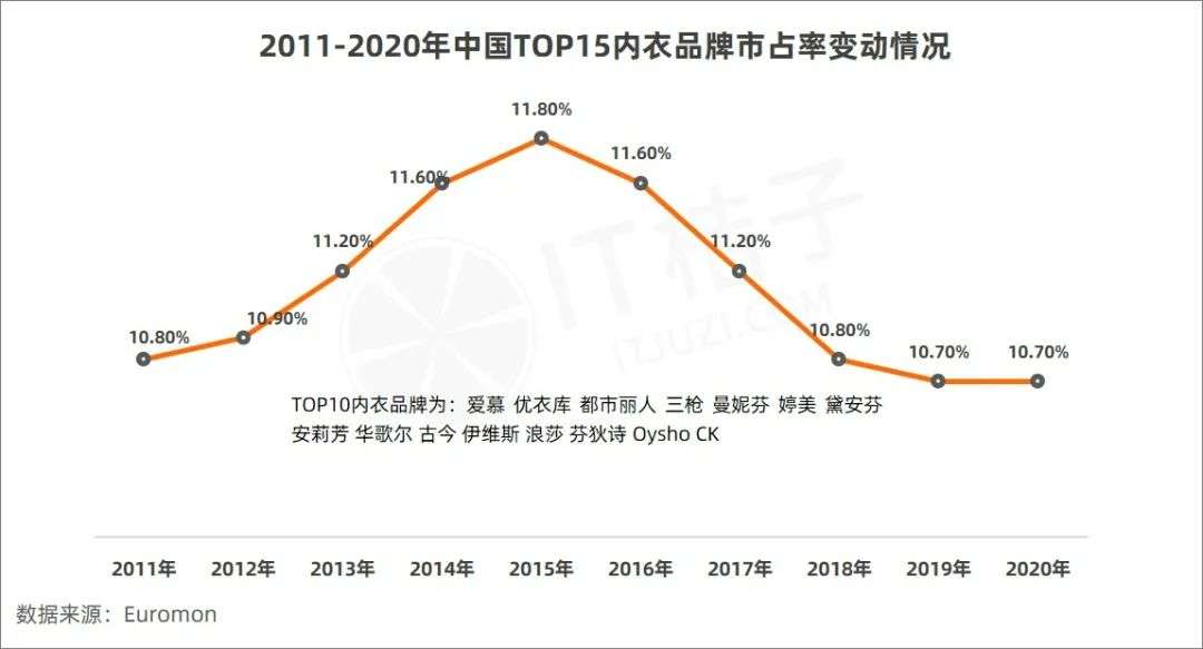 较低的行业集中度,给了新兴品牌机会。传统女性内衣以「性感」为标签,在「她经济」快速兴起的新女性消费时代,这一标签显然已不具有吸引力。据统计,2011 年女性内衣 TOP15 品牌市占率为 10.8%,2011 年-2015 年,市占率慢速上升,到 2016 年后,市占率开始呈下降趋势。当年,代表着「舒适、自由」的无钢托、无尺码网生内衣品牌的诞生,迅速挤占女性内衣市场。