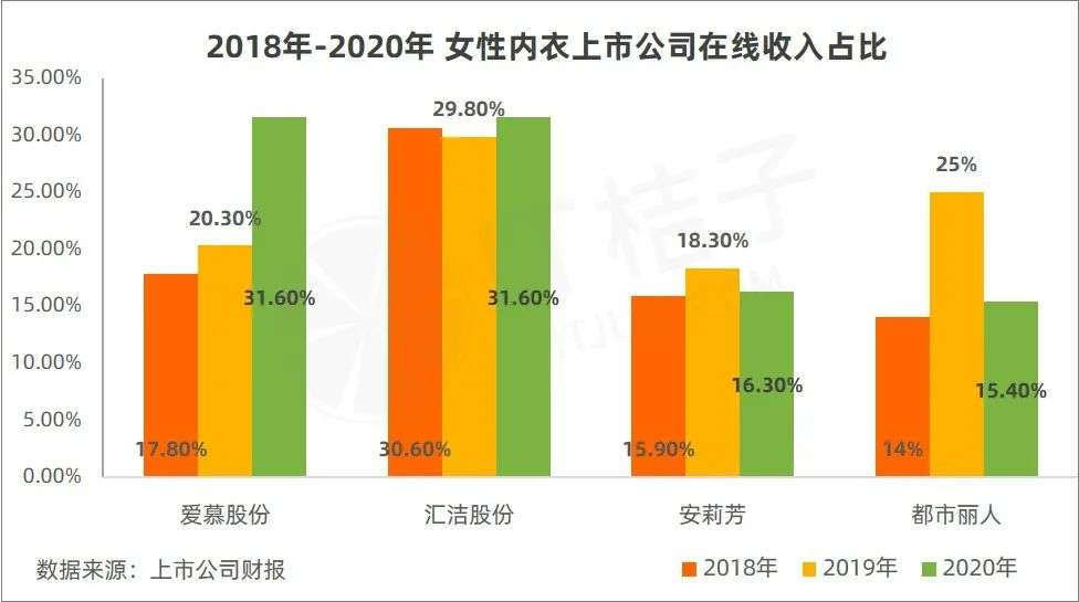 新老内衣品牌的对决,不仅体现在产品上,在销售渠道上也呈现结合与补充、一主一辅相辅相成的局面。众所周知,老牌内衣品牌以线下店为基础,网生内衣品牌以线上为基础。但近些年老牌内衣品牌不断开拓线上渠道,据财报显示,2020 年爱慕股份及汇洁股份线上营收占比都已超过 30%。爱慕股份在线营收占比由 2018 年的 17.8% 一路上升至 2020 年的 31.6%,两年上升近 14 个百分点,当然 2020 年线上占比较高自有新冠疫情的因素,但据爱慕股份 2021 年半年报显示,其今年 1-6 月电商渠道营收占比已达 26.67%;汇洁股份线上营收占比一直维持在 30% 左右的比例;安莉芳在线营收占比在 15% 左右。