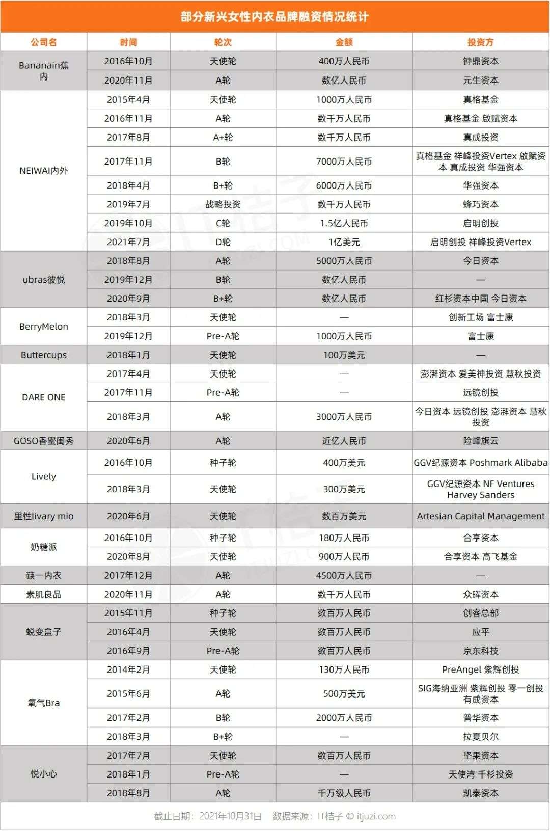 据 IT 桔子统计,自 2015 年起,15 家以「舒适」为卖点的新兴女性内衣品牌获得融资,15 家企业合计融资 37 次,已披露融资金额超 20 亿,背后资方 45 家,其中真格基金 3 次参投内外。今日资本参与 Ubras 的 A 轮 5000 万融资及 B+轮数亿人民币融资,并落子轻奢女性内衣品牌 DARE ONE。另外,2020 年以后,在这个赛道里已出现红杉中国、祥峰投资、启明创投、GGV 纪源资本等知名头部机构的身影。