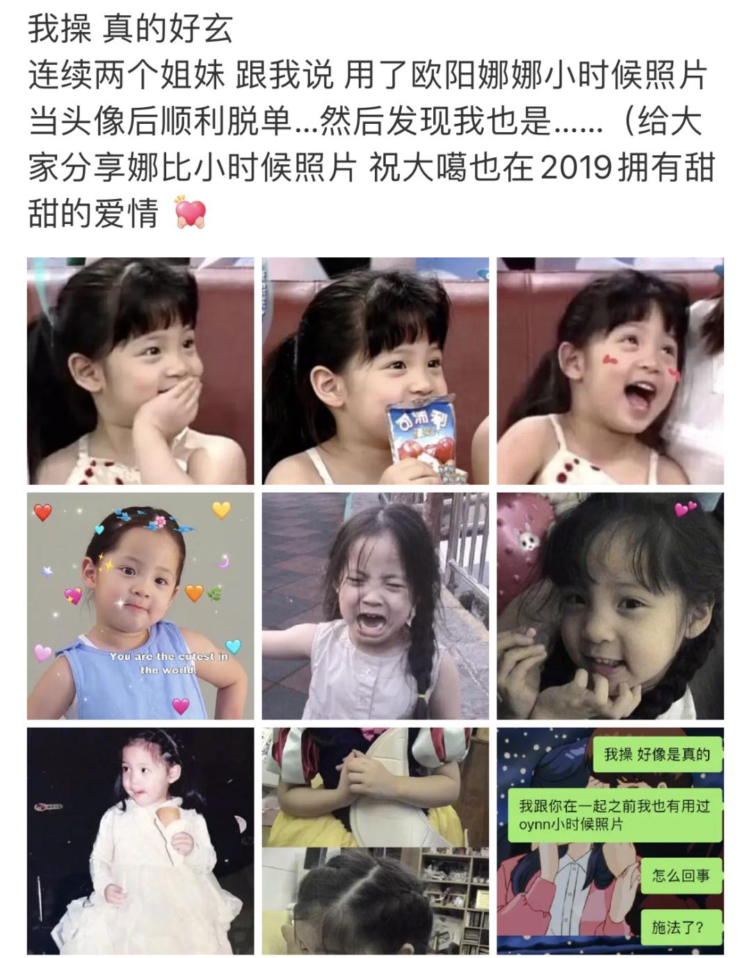 费沁源本身并没有什么值得一提的脱单事迹。与此相反,欧阳娜娜一度因为身边帅哥环绕,有幸被网友挑中,成为人均一份的脱单头像,#听说用欧阳娜娜头像会脱单# 也曾高挂热搜榜第一,可见其灵验(指路分析→你为啥一边骂欧阳娜娜,又一边模仿她?)。