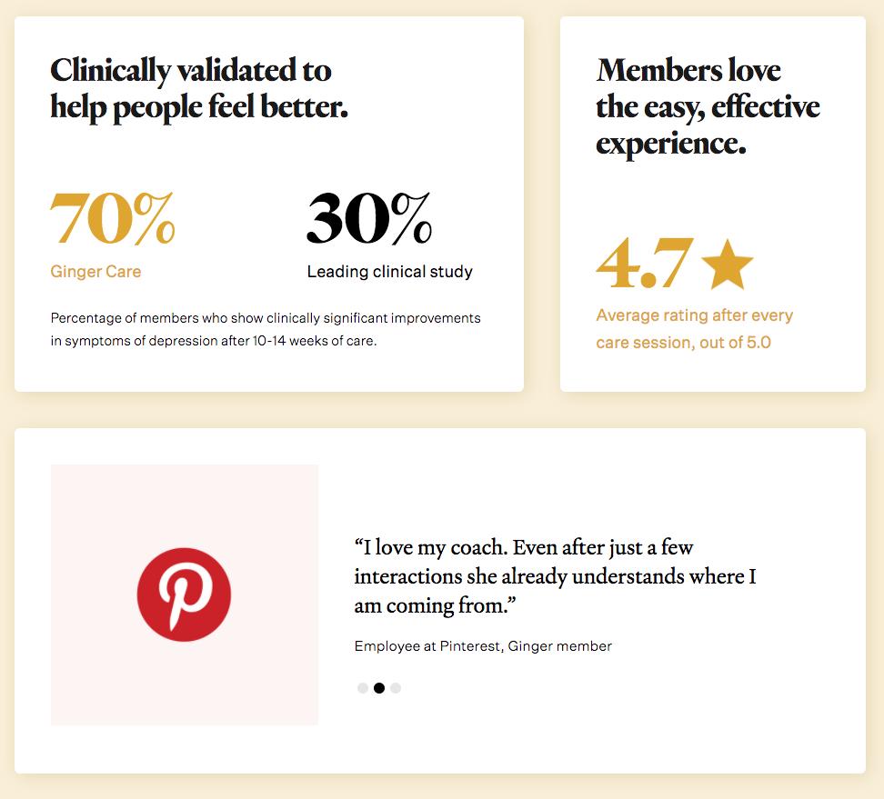 今年刚刚与Headspace合并的Ginger,就是为雇主使用的聊天应用程序,可为员工提供直接咨询服务。Ginger声称自己的算法会分析某人使用的词语,然后依靠其从超过20亿个行为数据样本、4500万条聊天消息和200万条临床评估中获得的训练来提供建议。