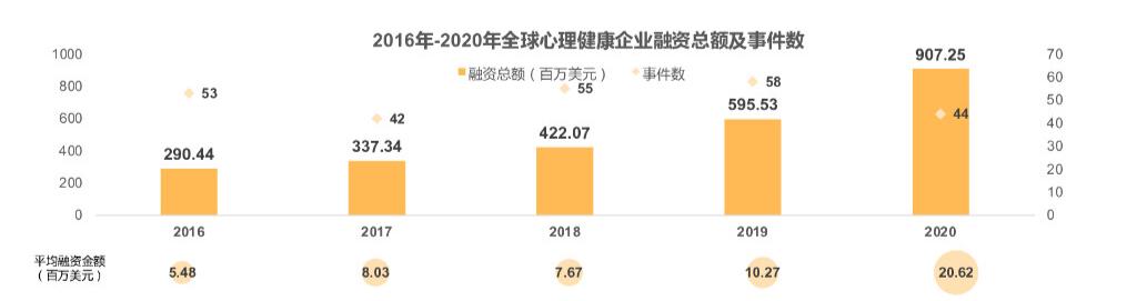 数据显示,2020年数字心理健康领域发生44起融资事件,累计融资9.07亿美元,同比增加52%;平均单笔融资金额达2000万美元,约2019年的2倍。在国内,专注心理健康的公司不多,近年来每年不到20起融资事件,平均金额也控制在100-200万美元。如此看来,在心理健康领域的创新,我们能做的还有很多……