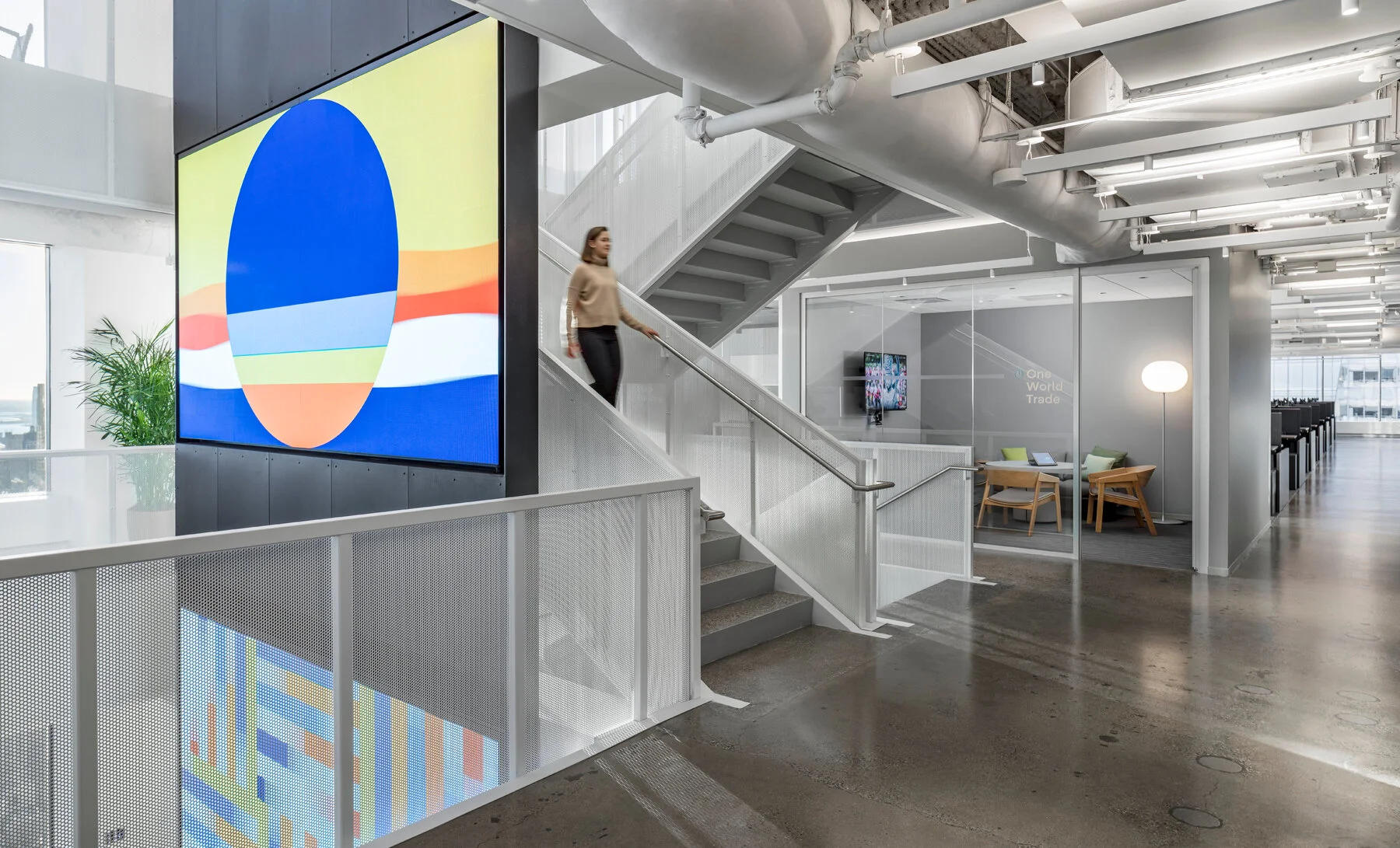 SOM事务所有一个客户是一家科技公司,其位于美国纽约曼哈顿闹市区格蕾丝大厦(Grace Building)的办公室足足有9.5万平方英尺(约合8830平方米),SOM事务所为该客户设计了一个称之为“建在大厦中的城市”。其中,办公室中庭设计了一个贯穿相连的楼梯井,仿佛一个核心神经系统。