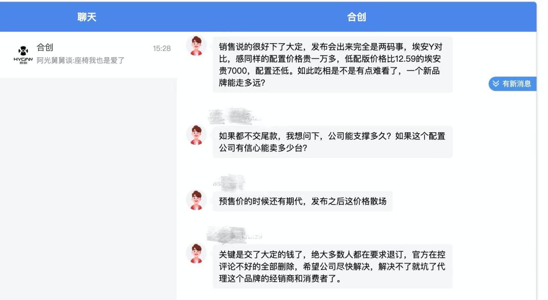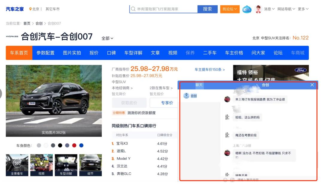 “合创汽车在一众电动车品牌里,就像你吃火锅的选择有海底捞、小龙坎、葫芦娃,而合创就像自热火锅”。一位从事汽车行业工作十余年的营销人员对作者表示,他认为合创汽车在新能源汽车中的存在感较弱,另外,在产品设计、营销手段上,也比较“速成”。