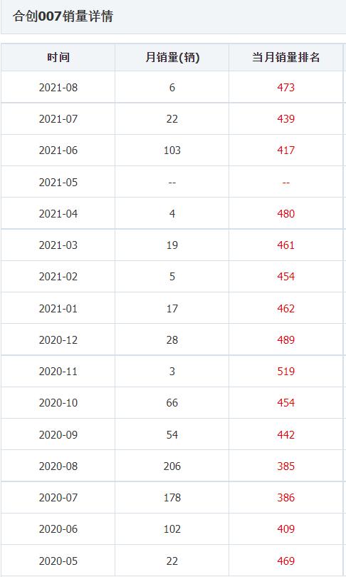 在中汽协、乘联会等汽车研究机构平台上,10月的新能源车型销量排行,合创汽车的两款车型没有上榜。据乘联会数据,合创汽车“007”车型在6-9月销量分别为103辆、22辆、6辆、29辆,呈现一路下跌趋势。在车主之家的月销量平台上,合创007最好的月销量排名是第385名。