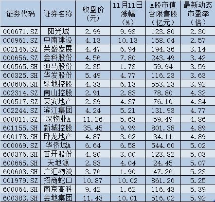 提及估值,截至11月11日收盘,房地产行业最新动态市盈率为10.96倍,行业内42只成份股最新动态市盈率低于这一数值,其中,13只房地产股最新动态市盈率低于5倍,阳光城、