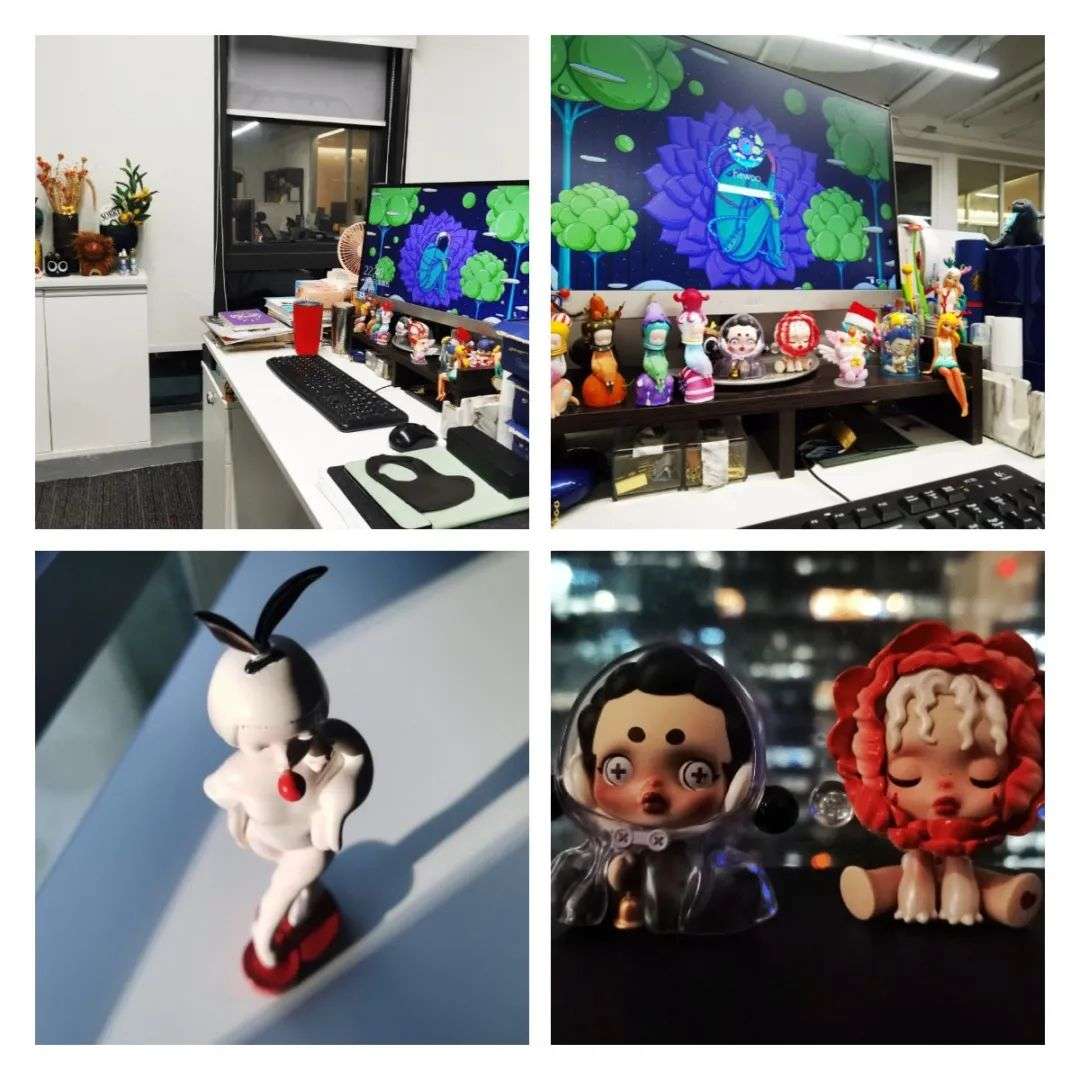“每天在工位10小时以上。我喜欢收集动漫电影里的卡通玩偶,在家里摆放了很多。但由于总是加班,回家的时间太少,我实在没有时间摆弄这些小人儿。我决定挑喜欢的带到公司,后来甚至把新购买的玩偶直接寄到这里。我是一名设计师,平时最喜欢给他们配对、组合、拍照,最后为他们编一个故事。”