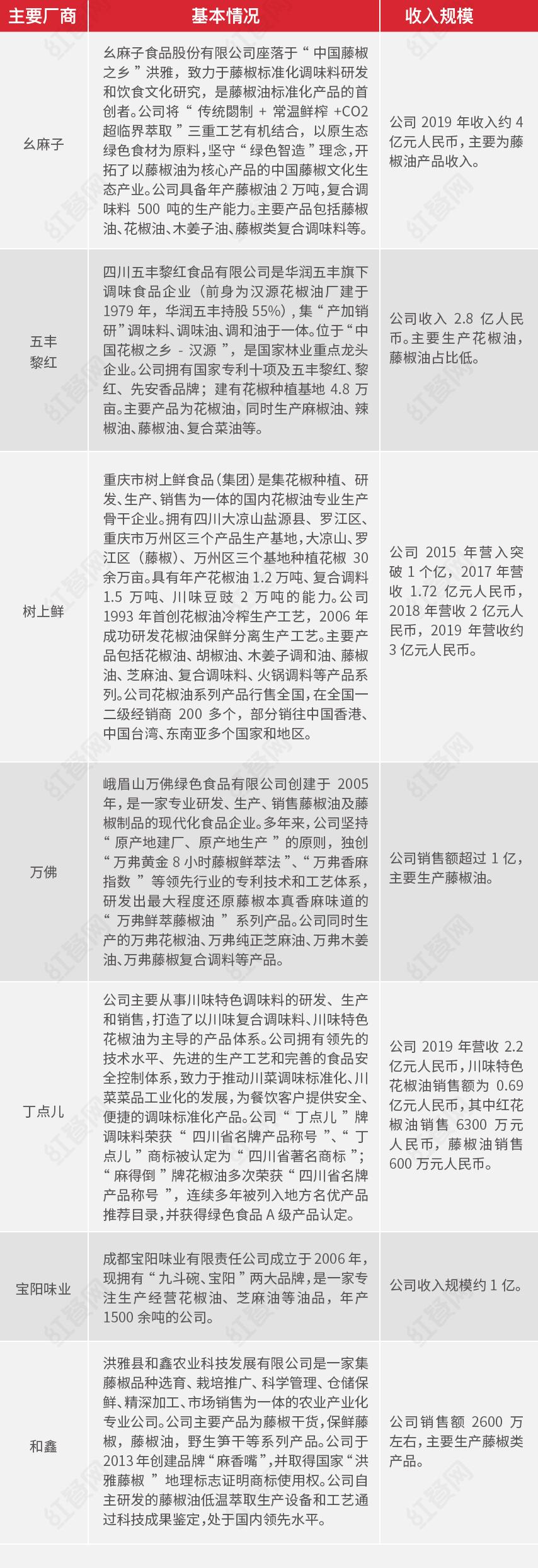 具体到细分市场来看,花椒调味油主要分为红花椒油和青花椒油两种味型。红花椒油麻味更重,典型的加工企业有四川五丰黎红食品有限公司、益海嘉里食品有限公司等。