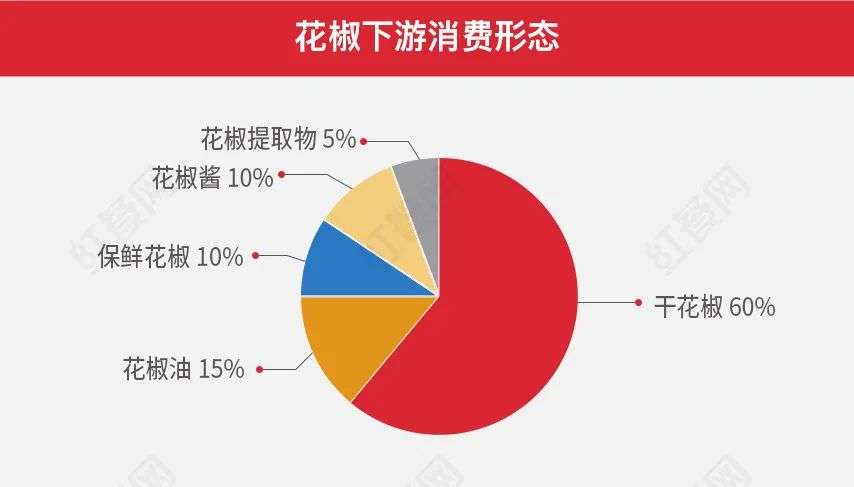 2021年初,网聚资本进行的一项调研访谈显示,花椒在下游的消费形态,干花椒占比约60%、花椒油占比约15%、保鲜花椒占比约10%、花椒酱占比约10%、花椒提取物占比约5%。粗加工农副产品形态的干花椒和保鲜花椒占比仍高达70%。