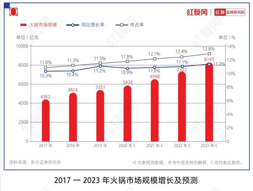 以高速发展的火锅市场为例,据红餐产业研究院数据,2013-2018 年火锅餐饮行业规模从 2813亿元增长至4814亿元,CAGR为 11.3%;2020年全国火锅门店近60万家,市场规模近6000亿元,预计2023年市场规模将突破8000亿元,CAGR为 12.8%。在这庞大的市场规模中,麻辣火锅就占据了半壁江山。