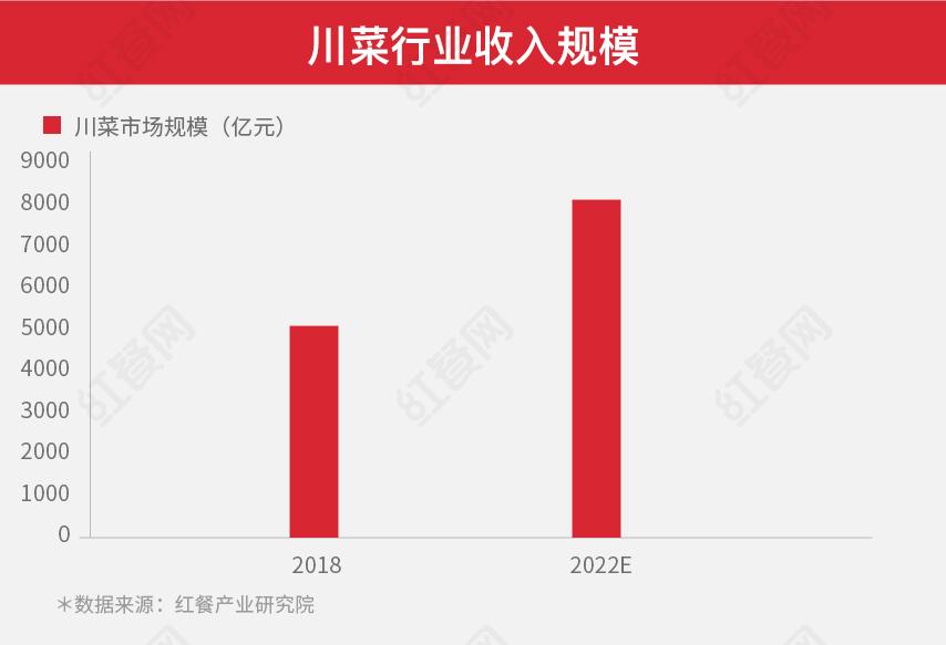 川菜市场的发展也不容小觑。红餐产业研究院数据显示,川菜市场规模在2018年突破 5000亿元,预计 2022 年将达8098亿元,CAGR 为12.8%。