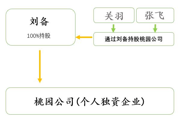 关羽和张飞分别与刘备签署了股权代持协议,至此三人的公司——桃园公司正式成立了。此时桃园公司股权架构如图: