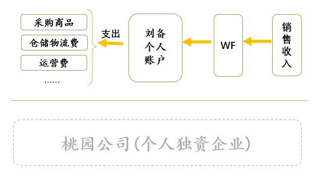此后,三人以桃园公司的名义在亚马逊等电商平台开了店,并且越开越大。每月的销售收入都有上百万,这些收入经由WF转入股东刘备的个人账户,然后三人再继续用个人账户的钱去采购产品、支付物流、运营等费用: