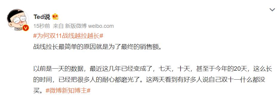 双十一的战线越拉越长,就是为了最终的销售额。以前是1天的数据,最近这几年变成了7天、10天甚至今年的20天,这么长的时间已经把很多人的耐心都给磨没了。
