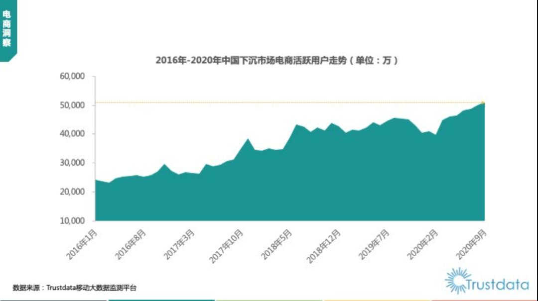 此外,根据数据机构Trust Date的统计,截止去年第三季度,下沉市场电商净新增活跃用户超过9000万,MAU达到5亿,线上月均消费同比增长23.4%。和线下消费渠道相比,线上电商消费的占比同比激增44.1%,占下沉市场消费者总支出的比例已经增加到21.1%。