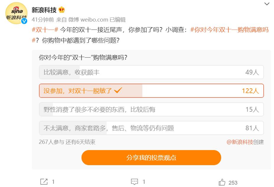 除了中青网在双十一前进行的调研之外,新浪科技双十一当天在微博上进行的舆论调查,也呈现出一边倒的趋势:表示没参加双十一、对双十一脱敏的网友,远超满意、后悔——甚至说不满意的网友。