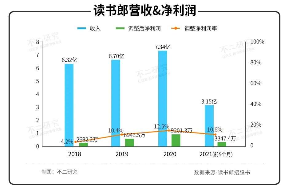 据招股书数据显示,读书郎2018-2020年,及2021年前5个月收入分别为6.32亿元、6.70亿元、7.34亿元和3.15亿元。